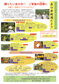 ○ミカン 昭和44年(1969年)よりミカンの栽培・研究を始め、昭和45年に新しく植えたミカンの苗木500本の中の未だ果実のつかない1本の苗木に注目・育成して、その後初結果した素晴らしい味のミカンの木が「原口みかん」の原木となり、現在はその子孫が全国に拡がり、広く栽培されています。全国の早生ミカンの面積で「宮川早生」「興津早生」に次いで「原口早生」となっております。「原口早生」は全国のミカン農家の為に特許は取らず無料で公開しております。 (特徴)12月のミカンとしてとても柔らかく甘い品種。